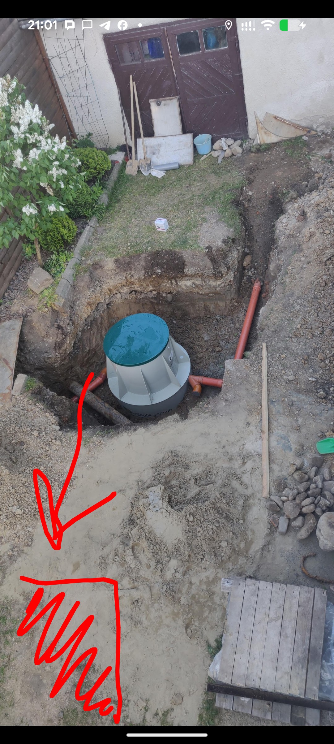 Частный дом, нужно установить дренажную систему (например, GRAF или другую) для приема очищенной воды после септика. Септик действующий (биосептик 1.5 м3/сутки) установлен 2 года назад. На фото размещение труб.